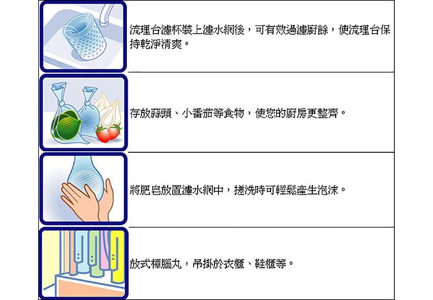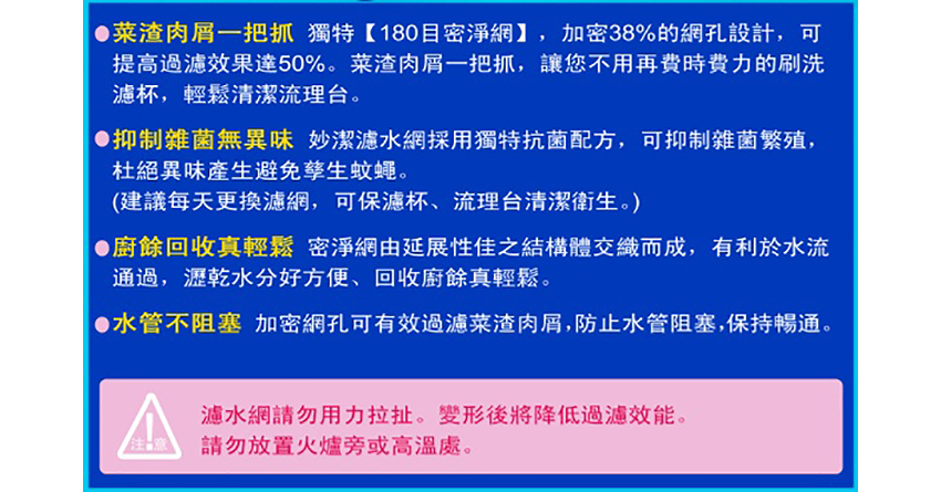 採用獨特抗菌配方可抑制雜菌繁殖杜絕異味產生,方便廚餘回收。密淨網由延展性佳之結構體交織而成有利於水流通過