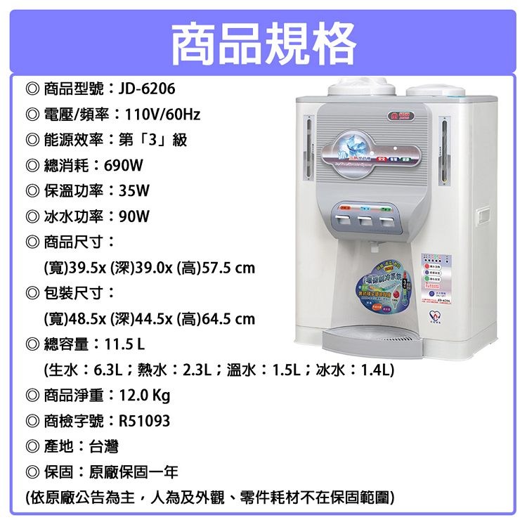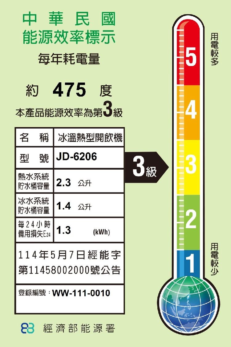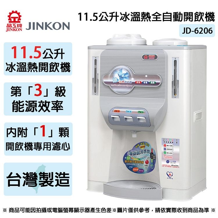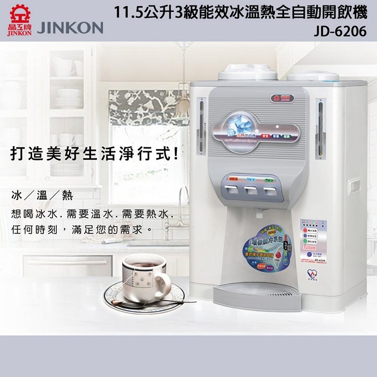 JINKON晶工牌 11.5公升3級能效冰溫熱全自動開飲機 JD-6206 ~台灣製