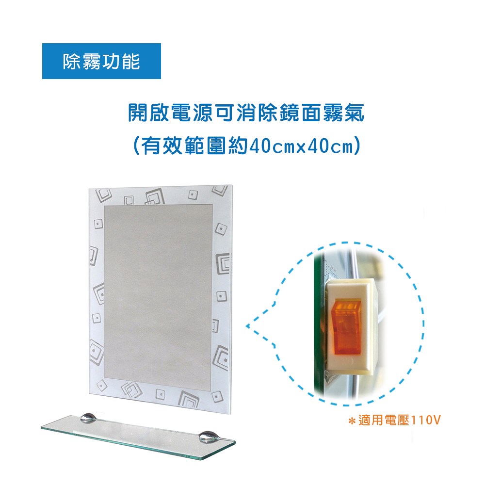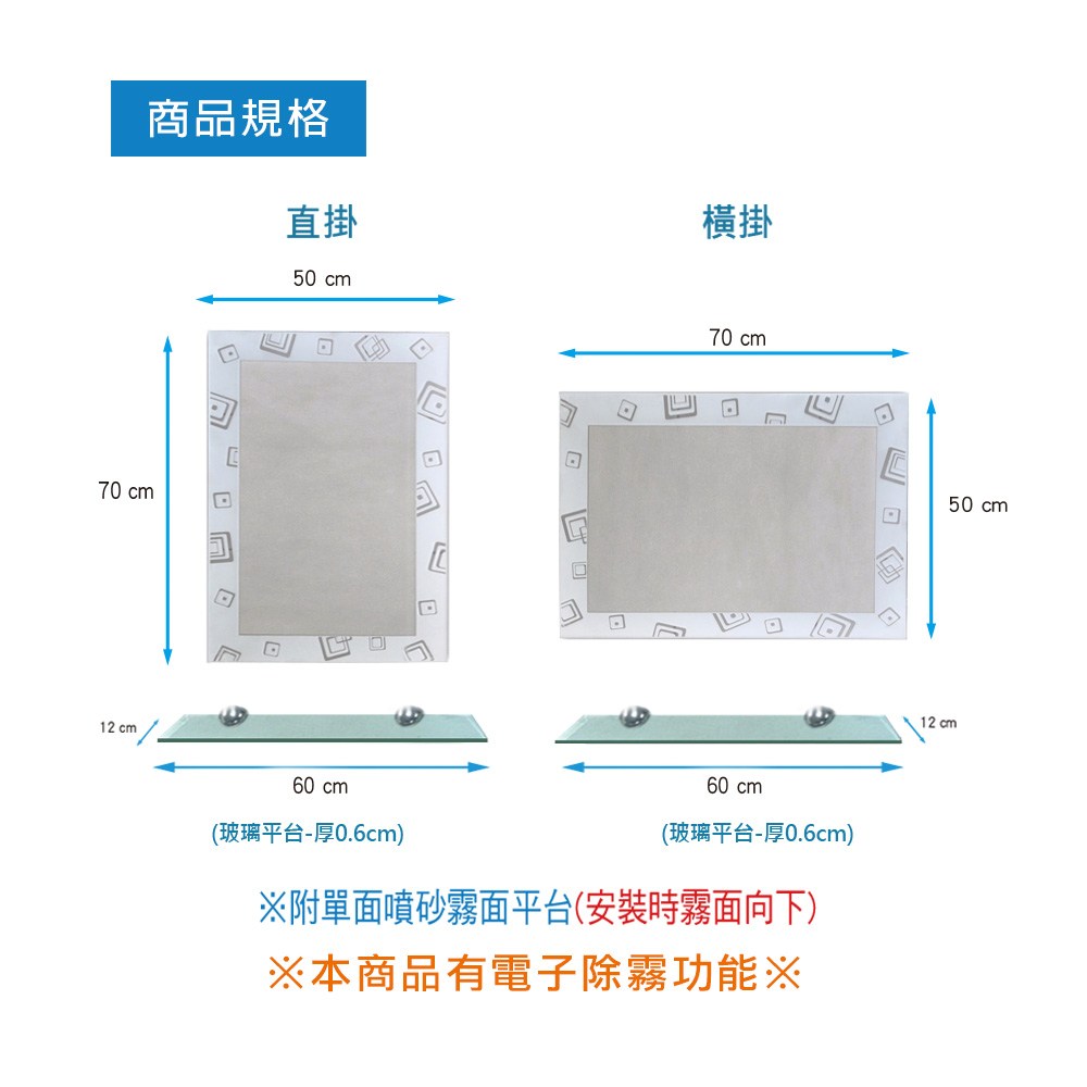 此款【噴砂雙掛防霧鏡-附平台 70x50cm】可依照居家空間需求直橫皆可掛、可搭配不同的裝潢格局。時尚噴砂圖案設計.增添居家品味。電子除霧功能.不起霧更清晰