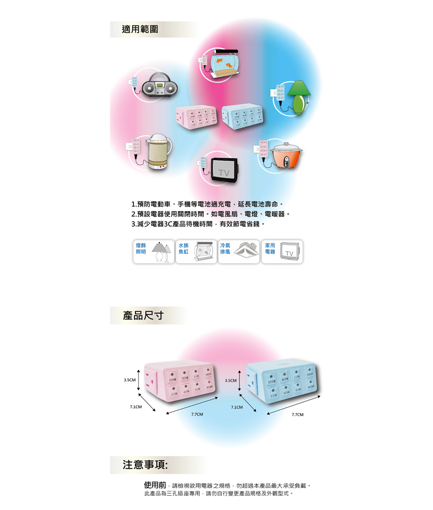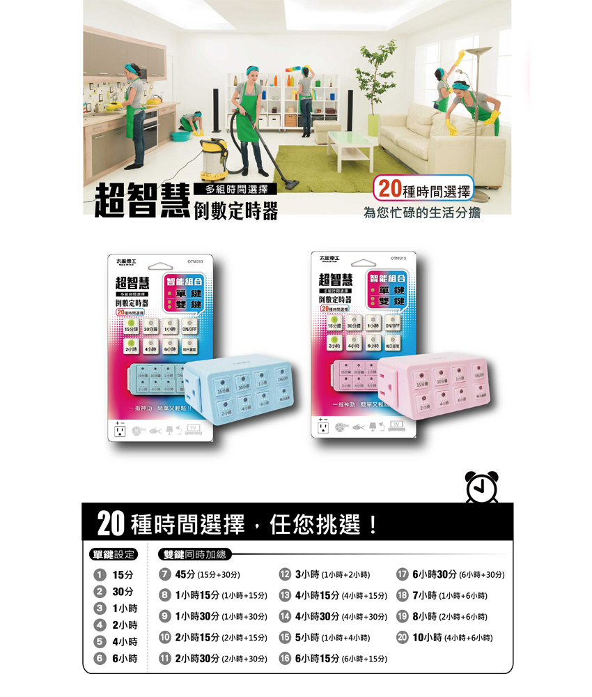此款【超智慧倒數定時器 混色】擁有20種時間選擇;可依照個人需求選擇時間,商品可預設電器產品使用關機時間、預防手機、電動車等電池過充電,延長電器壽命。本商品為混色,採隨機出貨