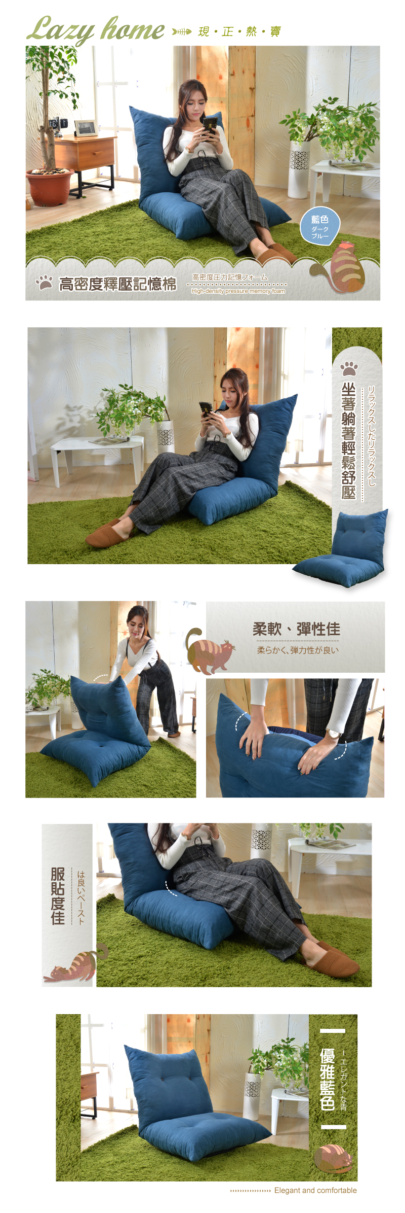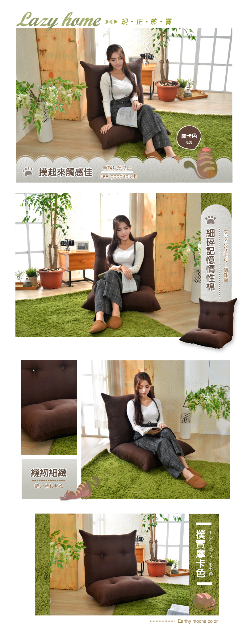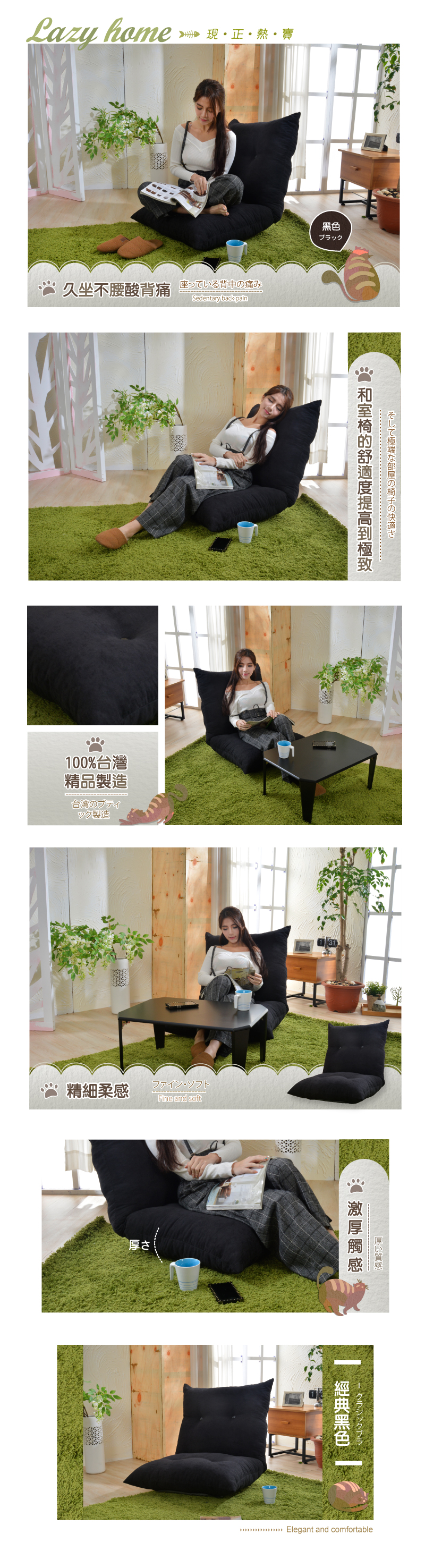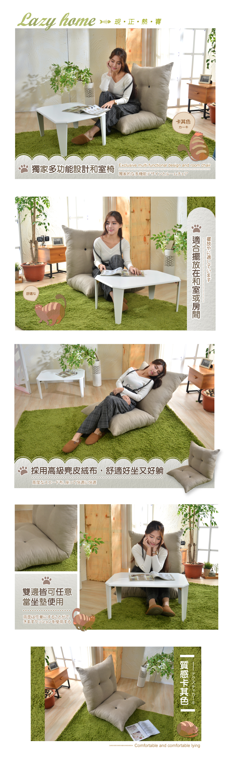 ‧ 胖胖貓和室椅靠背部可五段式的變化調整,椅背可全攤平使用。