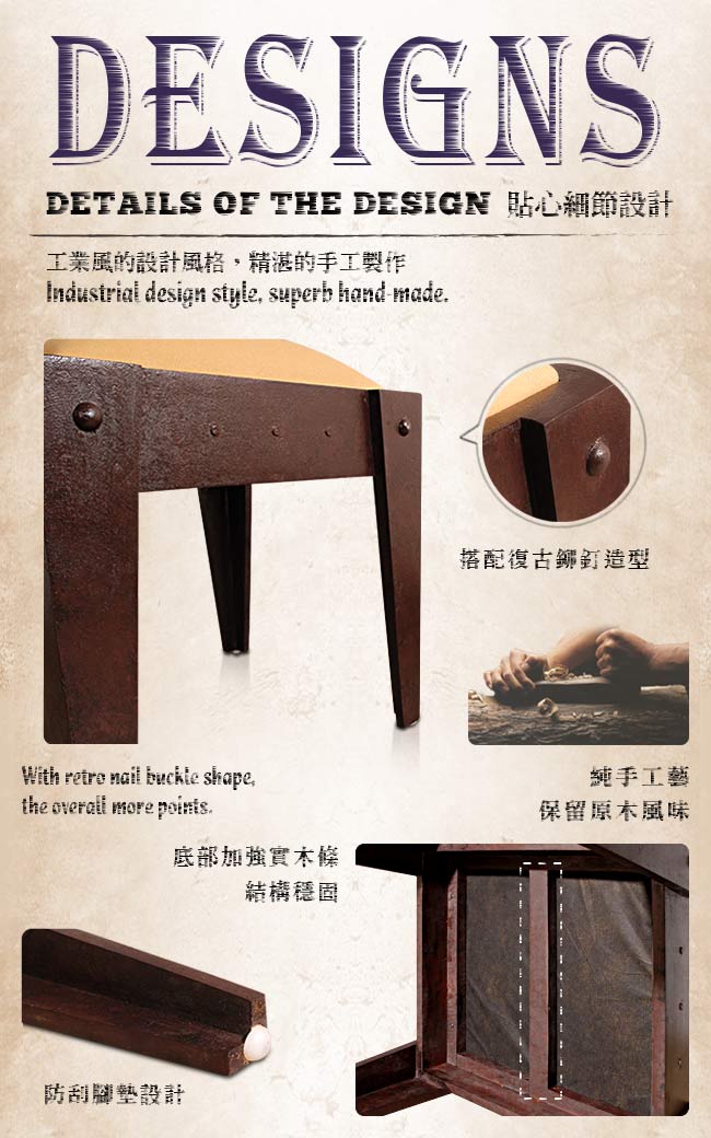復古刷色再覆上樹脂表面,12道上色程序與復古工藝,手工製作具有溫潤厚實,沉穩自然的感覺。和DOCKER PROFILE系列一起,建構出內斂狂放的神秘性格。椅座底部實木加固,堅固耐用,實用與質感兩者兼備。榫接手工技藝,強化穩固性,底部附塑膠釘保護地板。【ALMI】帶來截然不同的居家風格,在歷史元素與現代主義的交織下,打造了精緻細膩的工業風,彷彿置身於藝術領域之中,享受生活,用實木演繹著品味,適合與眾不同的您。