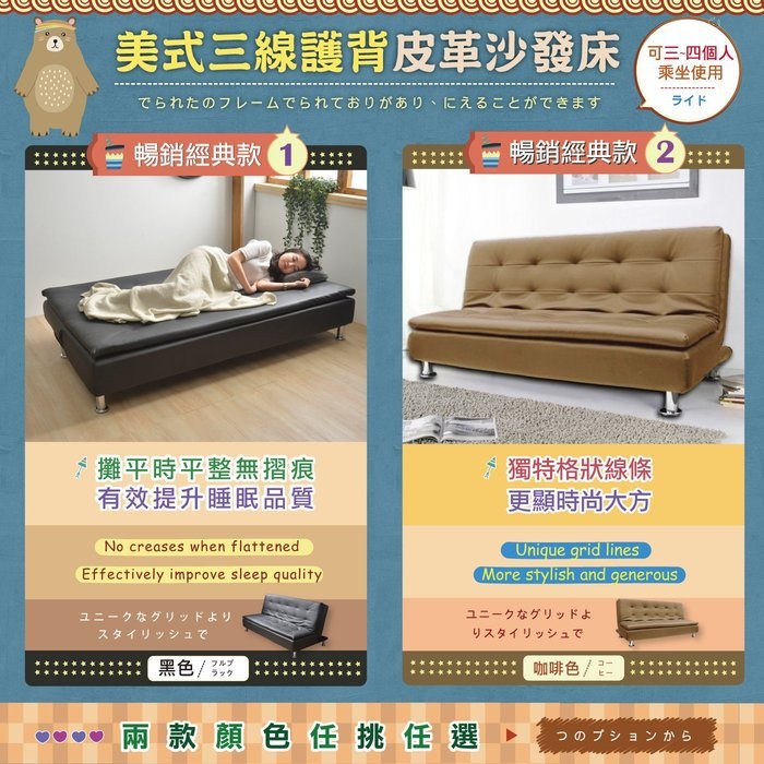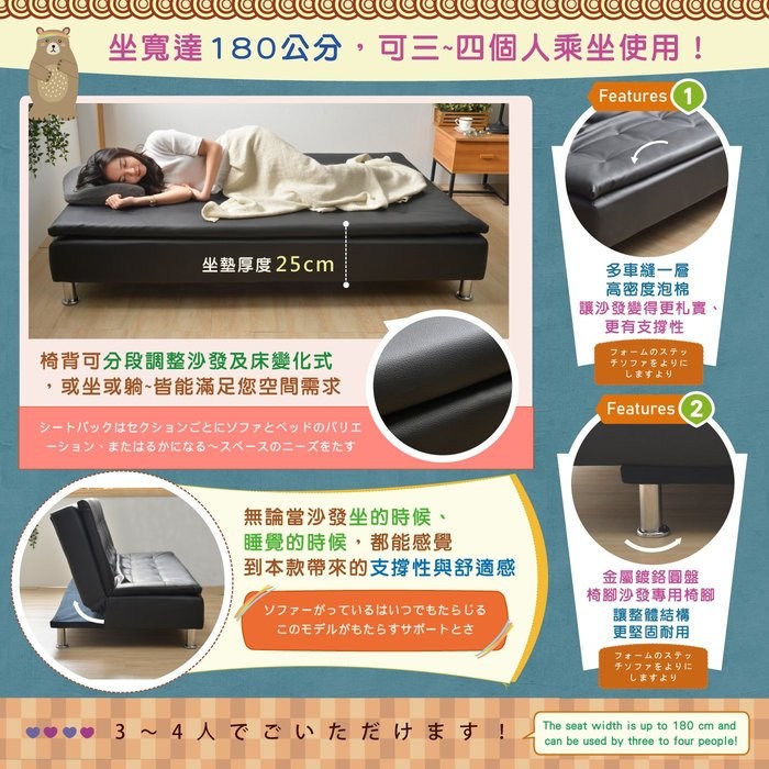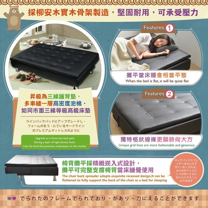 | ●商品名稱:【班尼斯國際名床~Design-三線護背皮革多人座優質沙發床】 《年度創意新款及一張好舒服的沙發床》 ~附 原廠保證卡,品牌經營、品質有保障~ ●商品簡介: ‧升級為三線護背墊,多車縫一層高密度泡棉,如同市面三線等級高級床墊 攤平時平整無摺痕-有效改善一般沙發床攤平的折痕缺點。 ‧攤平當床睡會相當平整,不會感覺到中間調整摺痕~有效提升睡眠品質。 ‧多車縫一層高密度泡棉,讓沙發變得更札實、更有支撐性。 ‧日本型錄暢銷經典款,獨特格狀線條更顯時尚大方。 ‧讓您或坐或躺~都能感受到舒適度的嫉妒提升,札實好滿意! ‧合成皮革易於清潔保養,髒了只要用布沾些水擦拭即可輕鬆去污。 ‧坐寬達180公分,可三~四個人乘坐使用! ‧2011創新款,獨家販售精緻皮料,立體車縫拉鈕造型更顯時尚。 ‧勢必要將沙發與床的共用發揮到最極緻。 ‧讓您無論當沙發坐的時候、睡覺的時候,都能感覺到本款帶來的支撐性與舒適感 ‧靠背部整各完整攤平成床,看電視、坐臥躺皆適宜。 ‧椅背可分段調整沙發及床變化式,或坐或躺~皆能滿足您空間需求。 ‧椅背攤平採精緻崁入式設計,攤平可完整支撐椅背當床睡覺使用。 ‧高密度釋壓記憶彈力棉具有最佳舒適性。 ‧採柳安木實木骨架製造,堅固耐用,可承受壓力。 ‧採用金屬鍍鉻圓盤椅腳沙發專用椅腳,讓整體結構更堅固耐用,居家美觀又大方。 ●商品規格: 1、商品件數:美式三線護背皮革多人座優質沙發床*1 2、材質: 外套-高質感舒適合成皮革(易於清潔保養) 骨架-柳安木實木骨架 坐墊-高密度泡棉、釋壓惰性記憶棉、透氣樹脂棉 、S型彈簧、沙發專用彈性織帶 3、尺寸: 椅:【寬 82cm* 長 180cm* 高 80cm】 【坐寬 180cm、坐深 54cm、坐高 37cm】 床:【寬 110cm* 長 180cm* 高 37cm】 4、顏色:黑色、咖啡 5、請支持班尼斯精品、給您最好的品質。 PS:此為大型家具: 採集貨方式由配合貨車集貨安排路線後配送,5-10各工作天配達 ,貨送前司機會先電聯,會將商品搬運上樓(限都會區~電梯大樓及無電梯四樓內搬運上樓)。 備註:為避免搬運時刮傷椅腳烤漆,椅腳由買家自行輕鬆DIY手動組裝! |