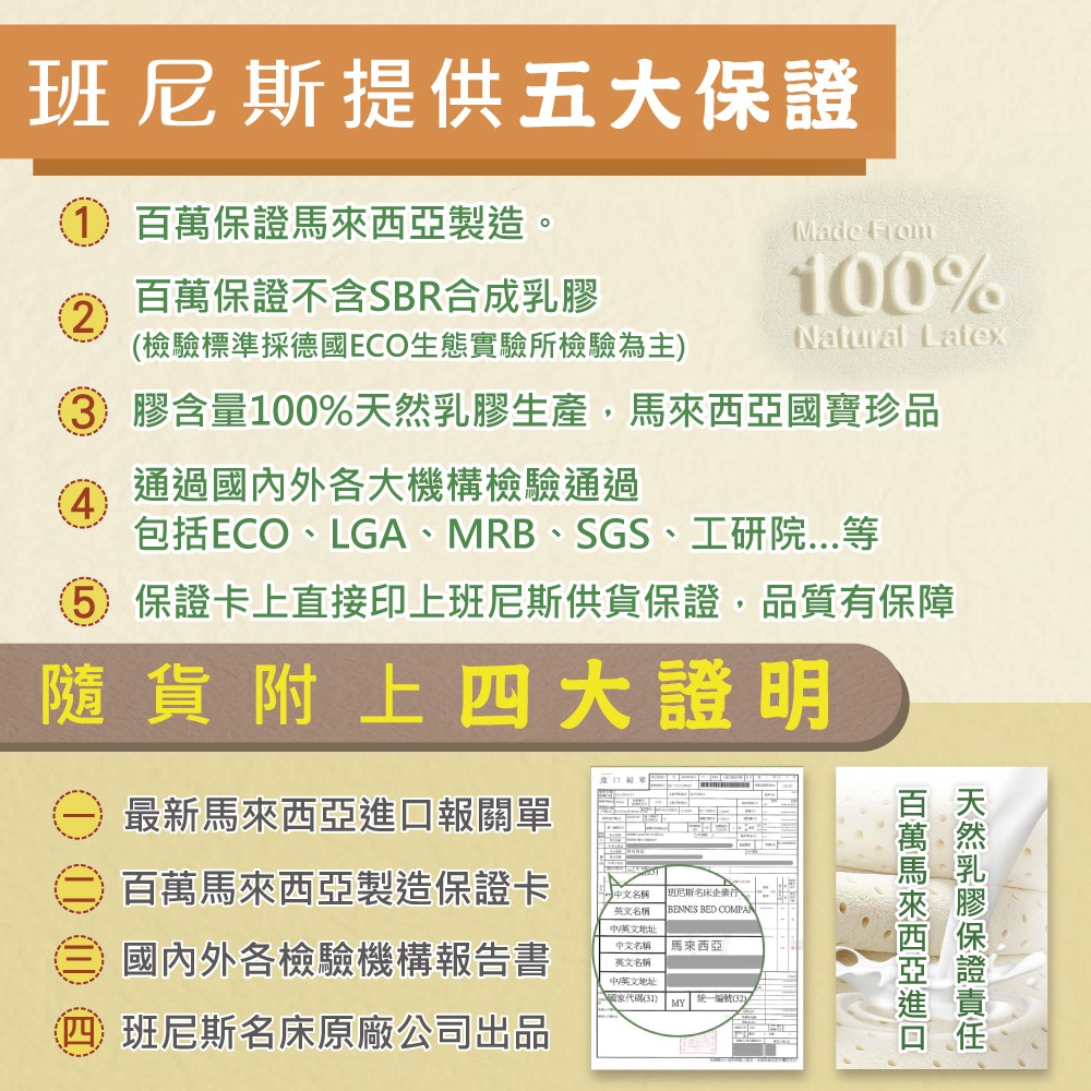 ‧【班尼斯保証】:班尼斯天然乳膠床墊、枕頭製品全都來自馬來西亞,雖然目前沒有任何一家業者能出示
