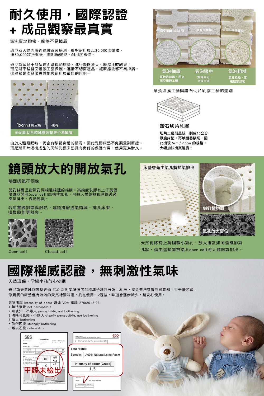 1、純度:利用照片中的雙孔法判斷,可讓您排除市場上 50%以上的化學乳膠製品。顏色太白不買、塑膠味道不買、表面光滑不買、用布套密封床墊讓您看不到也不要購買,更不要看到外觀漂亮如泡棉就覺得是極品,自己要能判斷。