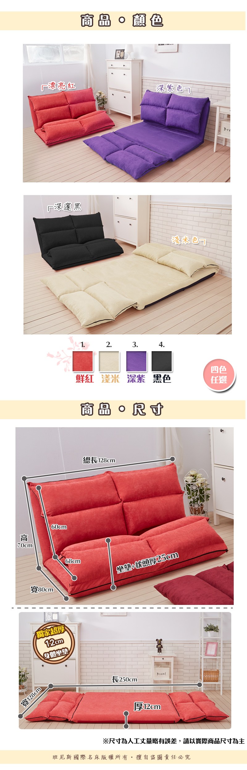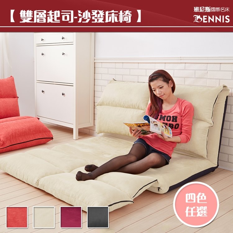 | ●商品名稱:班尼斯名床~超大尺寸‧雙層起司Cheese漢堡〈雙人睡〉沙發床椅 ~附班尼斯原廠保證卡,品牌經營、品質有保障~ ※堅持採用通過ISO-9001認證工廠生產高密度泡綿! ※堅持採用中鋼為原料的台灣鋼鐵調整骨架! ●商品簡介: (一)雙層內容物(枕頭+椅墊),飽滿厚實給您乘坐舒適好滿足。 (二)大尺寸高靠背設計,非大賣場小尺寸商品可比擬。 (三)椅背具五段式調整功能、多功能的操作角度隨心所欲。 (四)平舖時坐墊之坐墊亦可折起當足枕使用、靠背部之靠墊亦可當頭枕使用。 ‧ 獨家多功能設計和室椅,有別於一般市售沙發椅只能單邊使用; 這款分為長邊跟短邊~無論長邊或短邊~雙邊皆可任意當坐墊使用。 ●商品特色: (一)坐、靠墊可拆下單獨當和室墊或抱枕使用,與沙發椅結合為史上最強功能和室椅 (二)坐靠背之內容物使用高密度碎棉,可達人體凹凸而做填補作用, 可有效減輕身體之各部壓力,可充份消除坐臥持所產生之不適。 (三)高碳鋼骨架堅固耐用,不易變形,耐重壓。 (四)記憶細碎棉具釋壓、支撐、高舒適性、回彈性佳。 (五)科技聚合棉具支撐性、高密度泡棉具透氣性。 (六)採用布料具高質感,手感佳易清洗。 (七)坐臥躺皆宜,靠背部份可5段式升降調整。 (八)收納時僅需將之折平收納即可。 (九)本款沙發布套可全拆洗。 ●商品規格: 1、商品總件數:沙發床椅X1(如照片附超長頭枕及足枕) 2、尺寸規格: 椅 ~ 寬 128cm*長 80cm*高 70cm 坐深 68cm、背高 60cm、坐高 25cm 床 ~ 寬 128cm*長 250cm 3、材質:高碳鋼鐵架、高密度泡棉、記憶碎棉、高級麂皮絨布 4、顏色:麂皮漂亮紅、麂皮黝黑、麂皮淺米色、麂皮深紫色 ( 為保新鮮感~沙發背面顏色隨機變化,出貨依實品為主) 5、100%台灣製造,台灣班尼斯原廠公司貨,附原廠保證卡。 *本款統一由貨運寄送到一樓,需搬運上樓可加購搬樓層服務(限都會區)。
