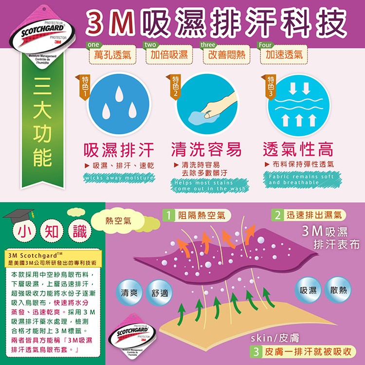 鳥眼布套經3M吸濕排汗處理、柔順觸感,下層吸濕,上層排汗,皮膚感覺舒爽