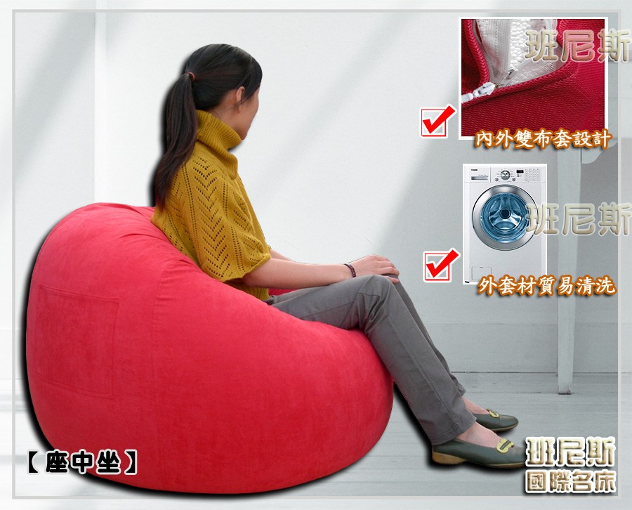 | ※《座高、座中、座低~都有不同的舒適感受,等您來體驗慵懶新生活!》 ∼附班尼斯原廠保證卡,品牌經營、品質有保障∼ ●商品簡介: (一)可以躺靠、也可以玩耍 (二)放置在空間的角落,水蜜桃造型逗趣 (三)不論置於客廳或是和室都非常實用 (四)可單獨當椅子使用 (五)仿間懶骨頭都是用便宜的布料或極大顆保麗龍製品製造; 唯有班尼斯給您真正的100%純白色 0.3~0.5cm輕型泡粒懶骨頭! (六)內為針織布、外為舒適布料~雙布套設計,外布套可輕鬆拆洗。 ●商品特色: (一)水蜜桃型的矮胖造型,不論置於客廳或是和室皆非常實用。 (二)可以躺靠、也可以玩耍,放置在空間的角落,可為生活帶來無限驚奇。 (三)高聚脂珍珠泡粒填充物是日本最流行的材質,能自由流動配合您所要的任何坐姿。 (四)不論放置在家中哪裡都可以成為最有個性的懶骨頭。 ●商品規格: 1、商品總件數: 超極中型泡粒水蜜桃懶骨頭 2、規格:中尺寸--直徑 80cm、高度 100cm 3、顏色:紅色、寶藍色、黑色、咖啡色、橘色、灰色 4、材質: (1)表面:舒適(紅色、藍色、咖啡、橘色彈性棉織布 / 黑色、灰色彈性直紡布)外布套+針織彈性內布套 (2)內容物:無重力 0.3~0.5cm輕型發泡粒子 5、班尼斯原廠公司貨,附原廠保證卡,品牌經營、品質有保障。 ●選購懶骨頭小常識: 有客戶反應仿間看到很多外型相仿懶骨頭,價格不一,到底差別在哪裡呢? ‧班尼斯商品絕不使用塑膠製成發泡板(簡稱:EVA)~其廢料材質燃燒會產生有毒氣體。 ‧班尼斯商品絕不偷工減料添加任何雜物、雜色泡綿及回收廢料。當您看到一顆懶骨頭裡面有各種顏色的不明填充物,那品質就堪慮了。 ‧班尼斯商品絕不偷工減料~將充填內容物採用超大直徑1~1.2公分保麗龍球。