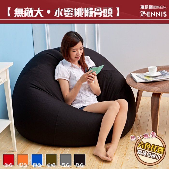 ●商品規格: 1、商品總件數: 超極大顆水蜜桃懶骨頭 2、規格:大尺寸--直徑 105cm、高度 110cm 飽滿札實--圓型水蜜桃球體狀--大顆滿意! 3、顏色:紅色、橘色、藍色、咖啡色、灰色、黑色 4、材質: (1)表面:舒適布料外布套+針織彈性內布套 (2)內容物:無重力 0.5cm輕型發泡粒子 (偏遠區域運費另計) 6、班尼斯原廠公司貨,附原廠保證卡,品牌經營、品質有保障。 ●選購懶骨頭小常識: 有客戶反應仿間看到很多外型相仿懶骨頭,價格不一,到底差別在哪裡呢? ‧班尼斯商品絕不使用塑膠製成發泡板(簡稱:EVA)。 ‧班尼斯商品絕不偷工減料添加任何雜物、雜色泡綿及回收廢料。 ‧班尼斯商品絕不偷工減料~將充填內容物採用超大直徑1~1.2公分保麗龍球。