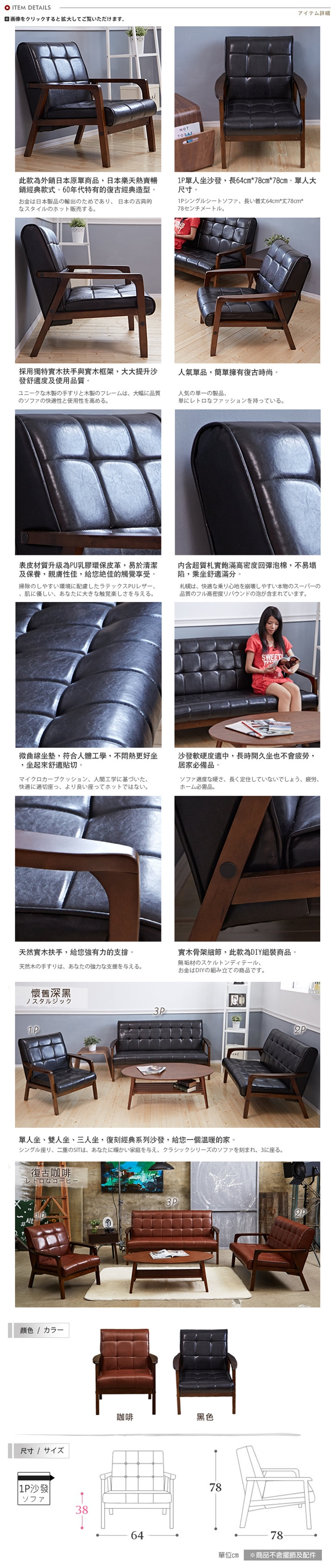 | ●商品名稱:【班尼斯國際名床】日本熱賣‧Kojiro小次郎單人皮革沙發/復刻沙發/另有雙人+三人座 ~附班尼斯原廠保證卡,品牌經營、品質有保障~ ●商品簡介: ‧外銷日本原單商品,日本樂天熱賣暢銷經典款式。 ‧內含高密度回彈泡棉,坐起來舒適貼切。 ‧表皮材質採PU乳膠皮革,經濟實用。 ‧獨特費工加料升級為PU乳膠環保皮革,讓您或坐或躺~都能感受到舒適度的嫉妒提升,札實好滿意! ‧PU乳膠皮革易於清潔保養,髒了只要用布沾些水擦拭即可輕鬆去污。 ‧PU乳膠皮革親膚性佳,帶給您絕佳的觸覺享受。 ‧內部材質札實飽滿~乘坐舒適滿分! ‧橡膠實木木框,給您強有力的支撐! ‧扶手以及框架採自然實木材質,每批取材顏色不定~故與照片略有色差,購買請同意此項說明。 ‧日本熱賣‧小次郎~單+雙+三人座復刻經典系列沙發 ‧另有販售【同款兩人/三人坐沙發】,歡迎至賣場選購。 ‧此款分為買家DIY自行組裝以及班尼斯專人組裝~兩種價格,組裝時間約15分鐘~建議由男生組裝。 ●商品規格: 1、材質: 外套-高質感舒適PU乳膠皮革(易於清潔保養) 骨架-實木框架 坐墊-高密度泡棉 2、尺寸:長 64cm * 寬 78cm * 高 78cm 坐寬 50cm、坐深 52cm、坐高 38cm、背高48cm 3、顏色:黑色、咖啡 4、請支持台灣班尼斯精品、班尼斯給您最好的品質。 PS:如採專人組裝+搬上樓(需另外加收搬運費300元):採集貨方式由配合貨車集貨安排路線後配送,5-10各工作天配達 ,貨送前司機會先電聯,會將商品搬運上樓(限都會區~電梯大樓及無電梯四樓內搬運上樓)。 ※無電梯大樓或透天厝~採手工搬運至第五樓酌收200元,六樓酌收400元..以此類推,請加購或現場支付給配送司機。