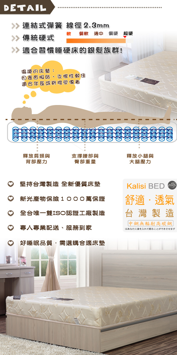Ally愛麗 3M防潑水護背硬式彈簧床墊-雙人5尺-小孩/長輩/體重重專用-防疫好眠