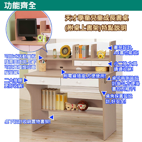 《天才學童》電腦/書桌:100%完全針對學習成長學童的專用書桌,配色活潑,功能齊全,可在小朋友年紀還小時當作單純的書桌使用,讓小朋友可以專心讀書,也可在小朋友大一點時將活動隔板拿掉,放置電腦螢幕學習更多元化,完全配合小朋友學習成長的貼心設計!寵愛您的寶貝,讓他有一個屬於自己的學習空間,增加學習興趣!