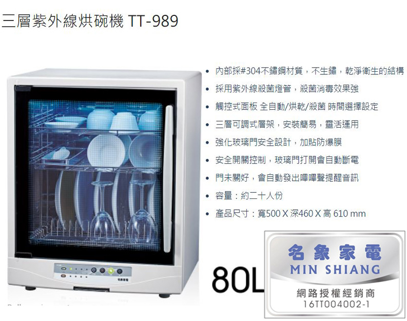 名象 三層紫外線殺菌烘碗機 TT-989 大容量碗盤收納 安全防護