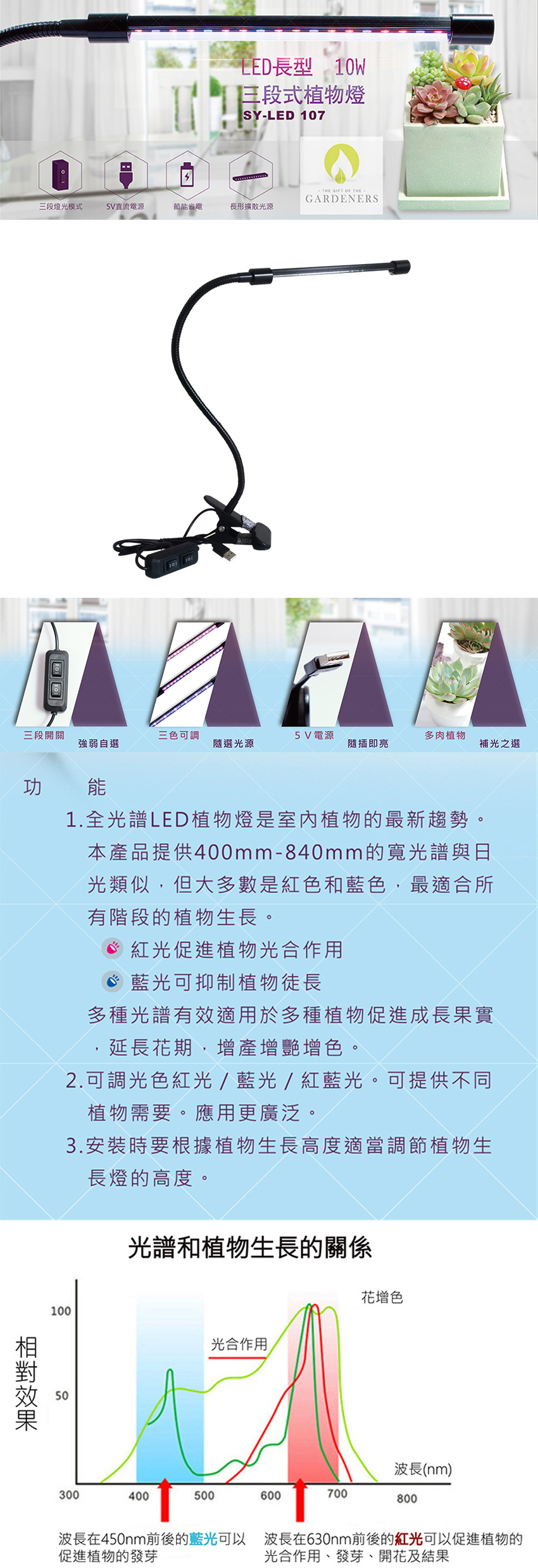 此款【LED 長型 三段式植物燈 10W 型號SY-107】可促進植物生長;多種光譜可提供職務不同需求。促進植物行光合作用