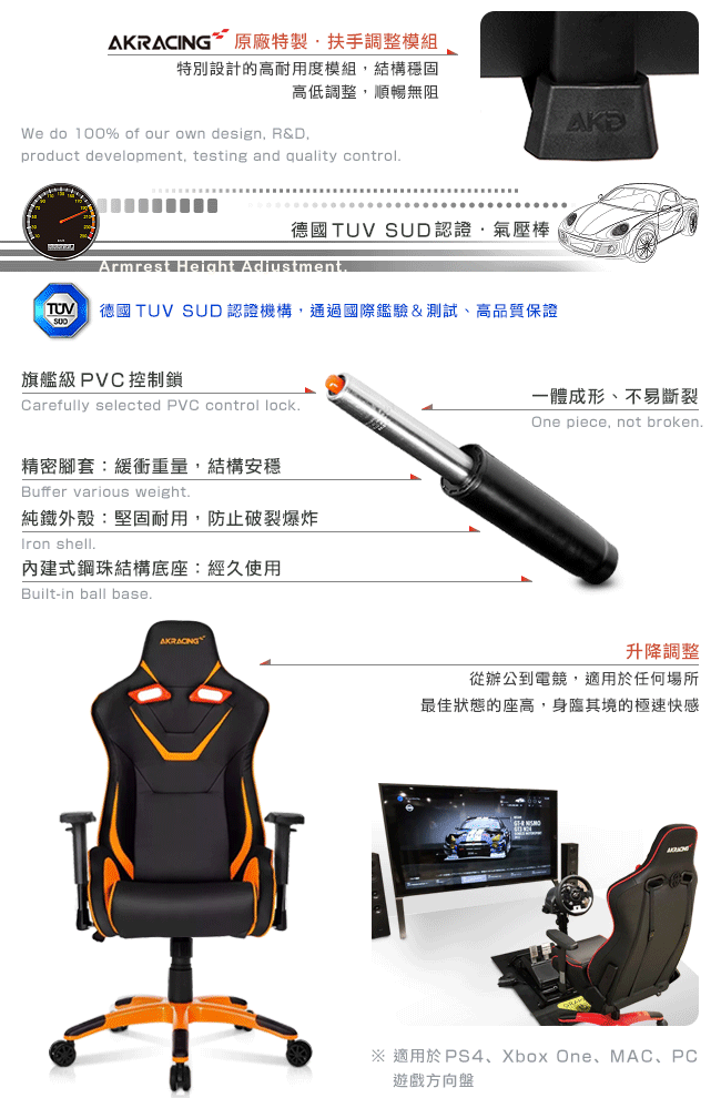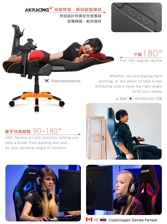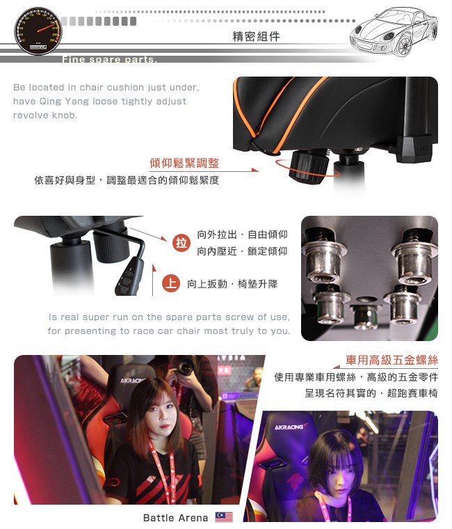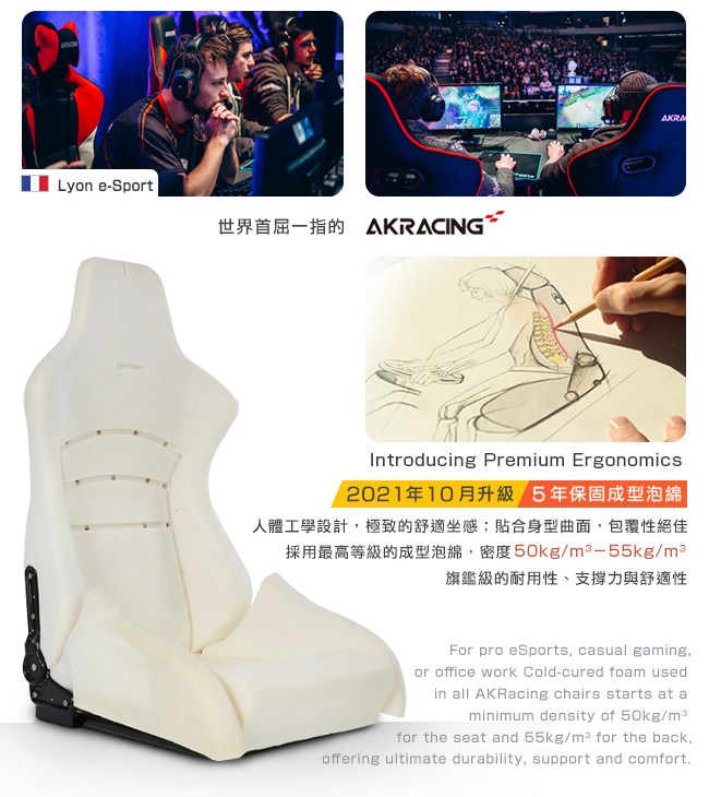 AKRACING倡導時尚前衛,引領電競遊戲、超跑賽車、辦公等各領域的座椅設計潮流,注重新型、環保材質的引進。嚴格控制製作過程中的所有細節,完美融合現代科技理論與生產實踐。經過不斷的發展,AKRACING擁有了一批極富創意的設計師,和技術精湛的專業製作團隊。AKRACING超跑電競椅,英雄聯盟職業聯賽的指定座椅之一,為電競玩家競相追捧的終極裝備。