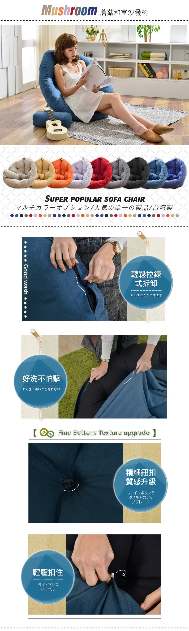 | 品名 | 【Mushroom日風-蘑洗‧蘑洗‧香菇懶骨頭可拆洗沙發】(附一顆小抱枕) |