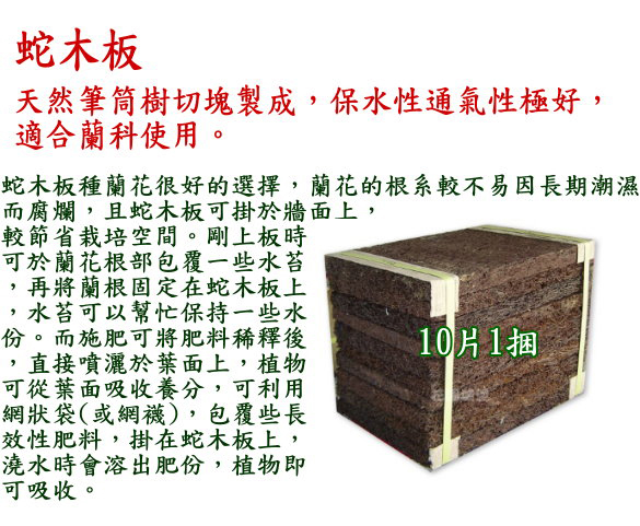 蛇木板種蘭花很好的選擇,蘭花的根系較不易因長期潮濕而腐爛,且蛇木板可掛於牆面上,較節省栽培空間。剛上板時可於蘭花根部包覆一些水苔,再將蘭根固定在蛇木板上,水苔可以幫忙保持一些水份。而施肥可將肥料稀釋後,直接噴灑於葉面上,植物可從葉面吸收養分,可利用網狀袋(或網襪),包覆些長效性肥料,掛在蛇木板上,澆水時會溶出肥份,植物即可吸收