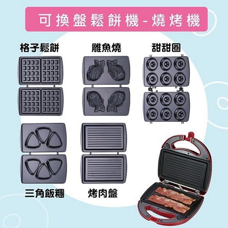 格子鬆餅、鯛魚燒、甜甜圈、三角飯糰、烤肉盤