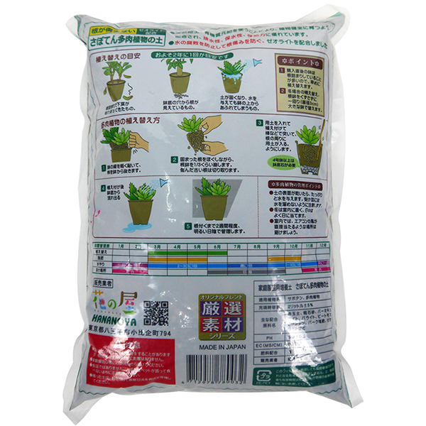 日本原裝進口之仙人掌與多肉植物專用培養土,天然粒質土壤,排水性、保水性與保肥力俱佳,日本特殊配方調製而成,內含有機質發酵之堆肥與防止根部腐爛之特殊元素是種植多肉植物健全發育最佳選擇,種植時可配合少量緩效性化學肥料當基肥使用,種植成效更佳。