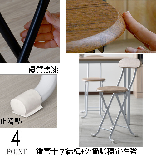 特別針對高要求的日本市場設計了 新款式---外撇腳,在靠近地面的鐵管改以外撇的造型,加工程序更加複雜,最主要的目的是讓 重心更加穩固並加強穩定度,四支腳座底端各使用一個 防滑橡膠,穩定不搖晃,更可保護地面免於刮傷;而座面下方設計有 安全扣環,將椅子打開使用後卡榫即自動扣上,讓您無論使用時或折疊時都因為 有卡榫而不會發生危險,不需要使用時,輕鬆即能將折合椅摺疊收納,完全不會浪費您的室內空間。