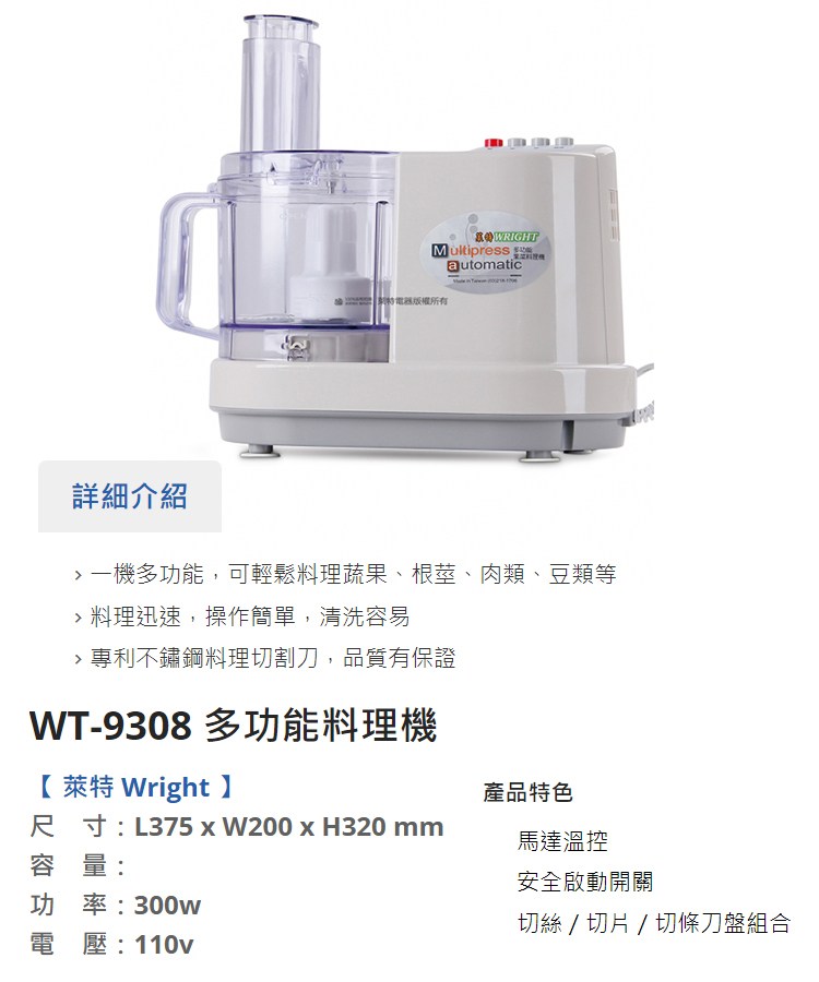 WRIGHT萊特多功能果菜料理機 WT-9308
