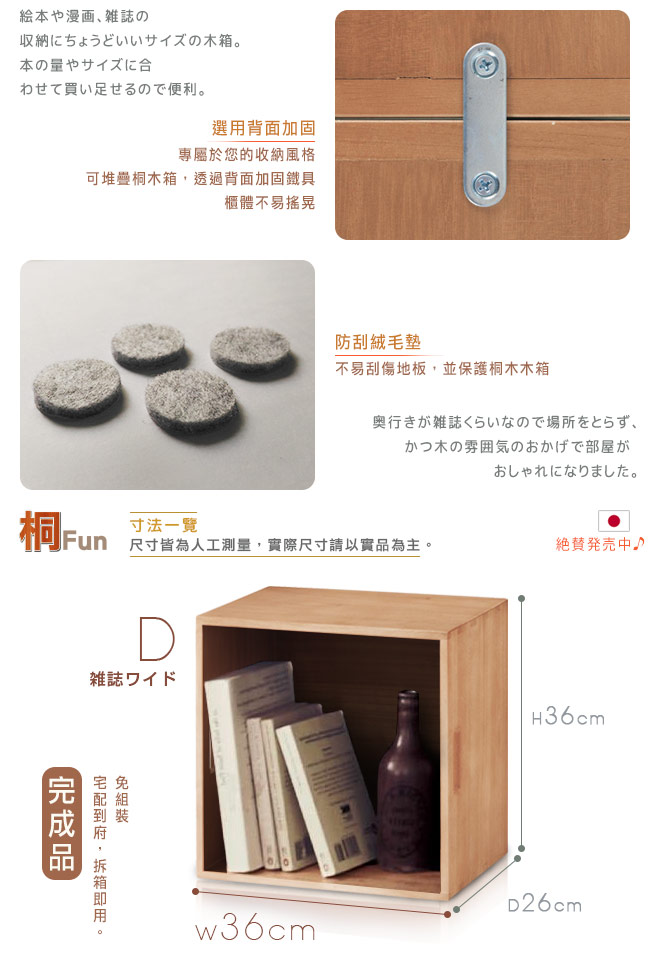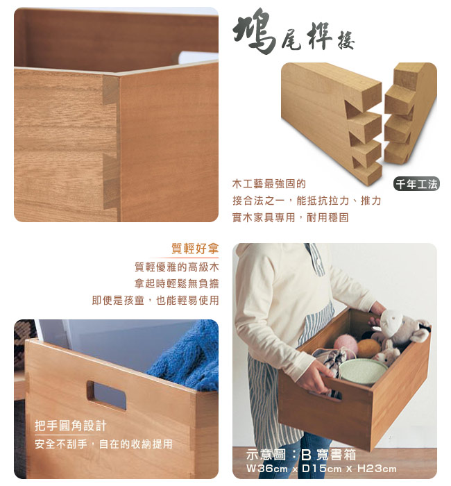 使要木工藝最強固的接合法之一:鳩尾榫接。實木家具專用的工法,耐用穩固。桐木箱輕巧好拿,輕量高級木材即使是孩童,也能輕易使用。把手圓角設計,安全不刮手,自在的收納提用,創造出收納與設計感並存的室內場域。選用背面加固鐵具,可推疊桐木箱,櫃體不易搖晃。成就居家美學的細膩度,收納達人的樂活life,不需理由就愛上了收納的奇幻之旅。