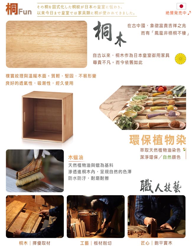 桐木質感醇厚大器,雋永質感,絕色驚豔;雋永的原木色搭配簡約的箱型設計,使單純的文件收納櫃有了品味。擺放各類大小物品隨心所欲,公文資料箱、玩具箱、書櫃…各種用途因地制宜因人而異,收納資料文件、置放各類物品,收納之間,井然有序,每格都是一則故事。傳統老工匠的榫接工藝,依據桐木原木特性設計創作,職人精神的手工、質感上乘的細節、豐富變化品味極致;融入於空間,遇見了美好。