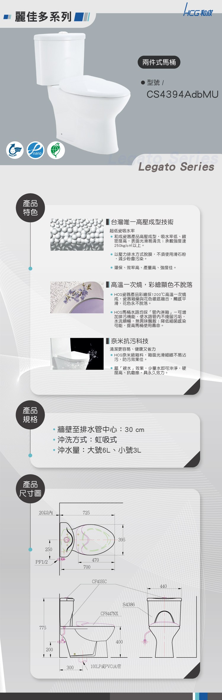 和成HCG 麗嘉多兩件式馬桶 白色 CS4394/96MU 含安裝 排水管距30公分
