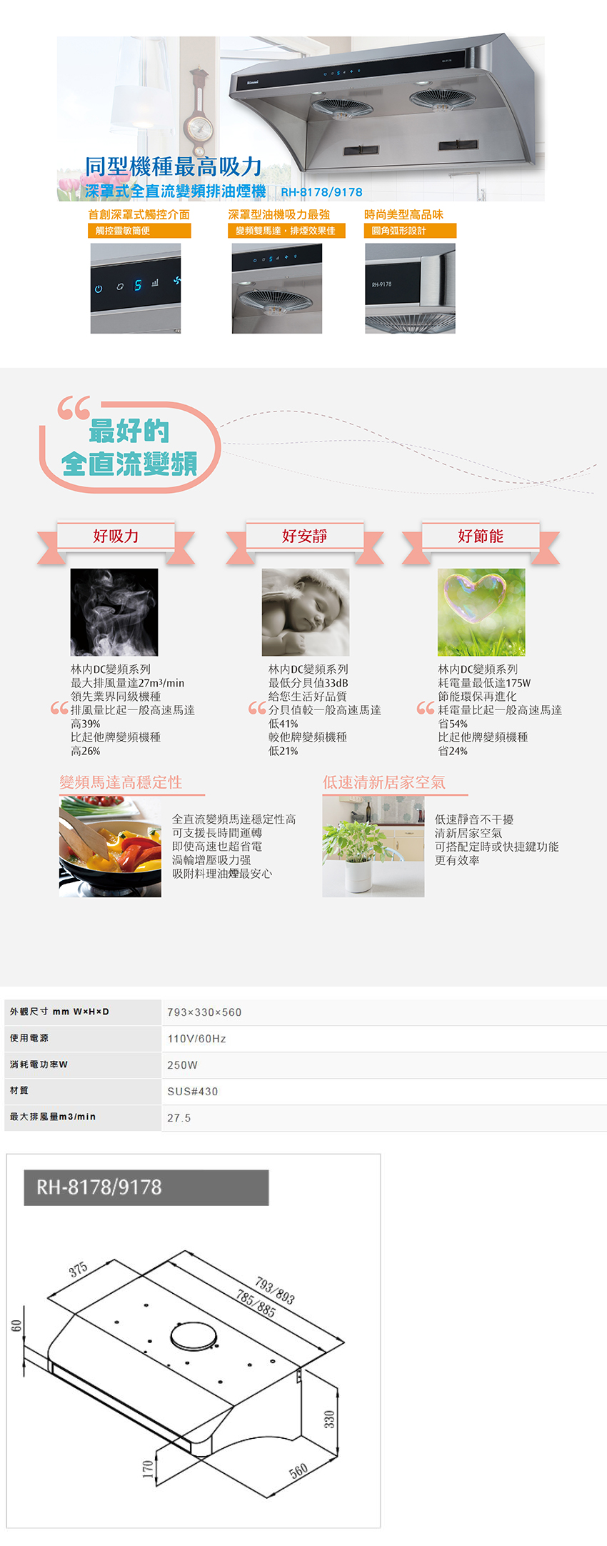 (含標準安裝)林內【 RH-8790R】隱藏式排油煙機(智能連動/不鏽鋼)80cm