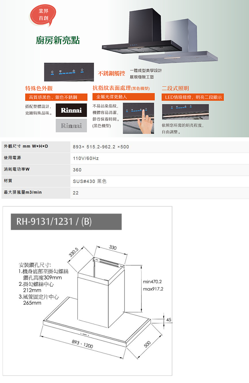 (全省安裝)林內倒T型不鏽鋼觸控90公分排油煙機RH-9131