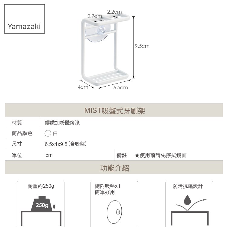 日本【YAMAZAKI】MIST吸盤式牙刷架(白)