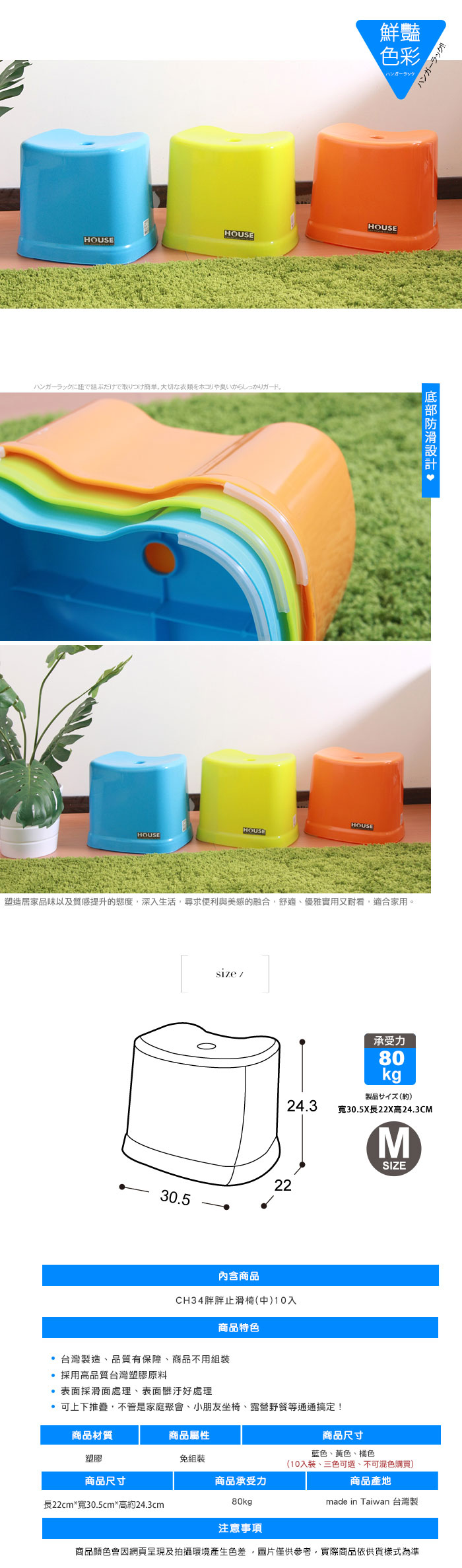 【HOUSE】胖胖止滑椅-中-10入/休閒椅/戶外椅/孩童椅/夜市椅(藍色