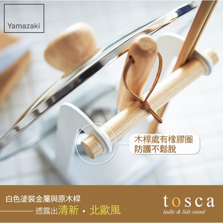 白色塗裝金屬與原木桿,隱隱透露出清新北歐風。特殊線條設計,輕鬆收納鍋蓋及湯勺,當食譜書架也沒問題!