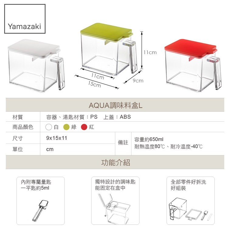 獨特設計的調味匙能固定在盒中,盒中有刮板可作簡單定量用