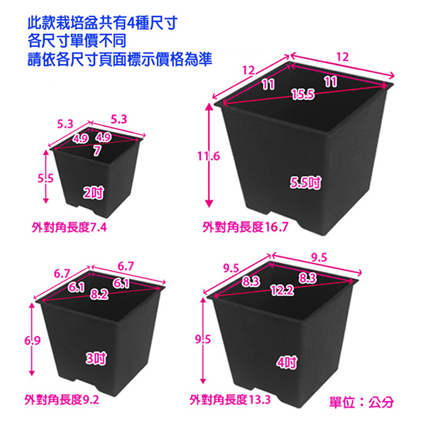 名稱:四方型栽培盆5.5吋-黑色(厚) 150個/組