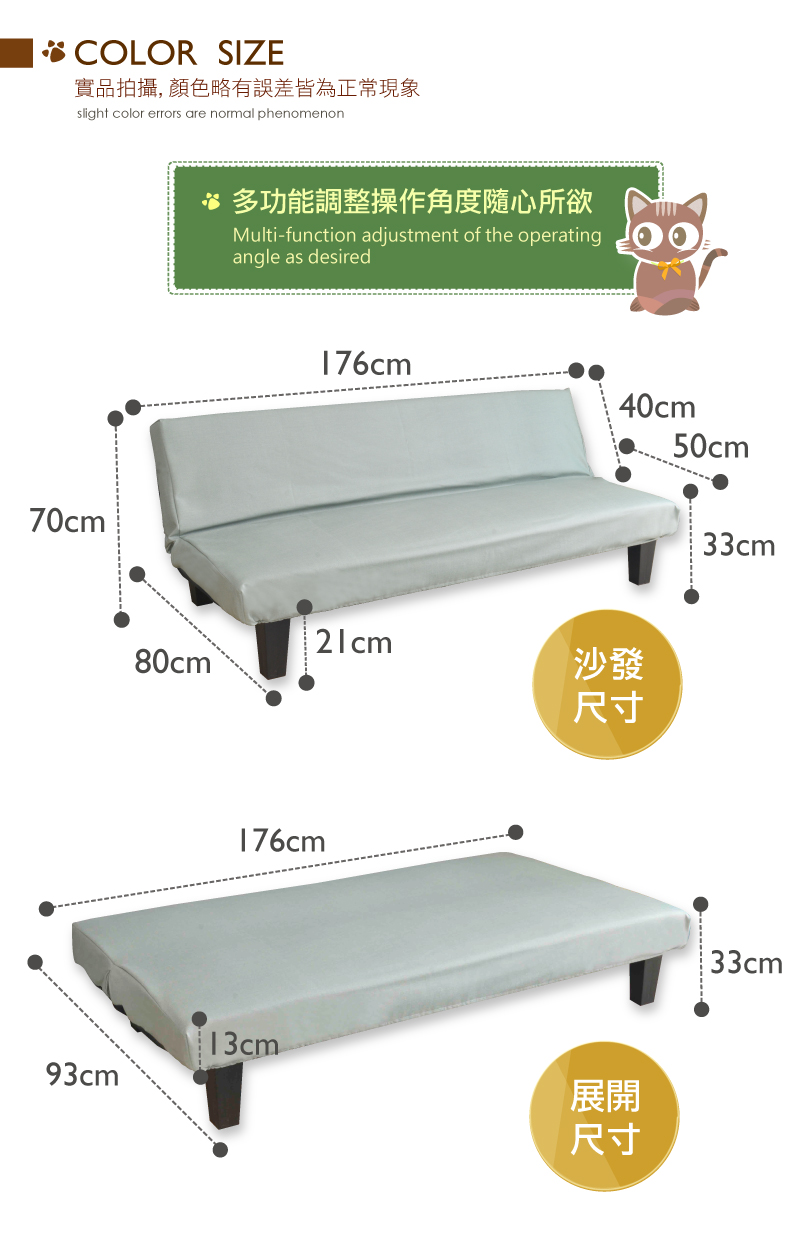 | 尺寸 | (椅):長 176cm * 寬 80cm * 高 70cm、坐高 33cm、坐深 50cm、坐寬 176 cm (床):長 176cm * 寬 93cm * 高 33cm |