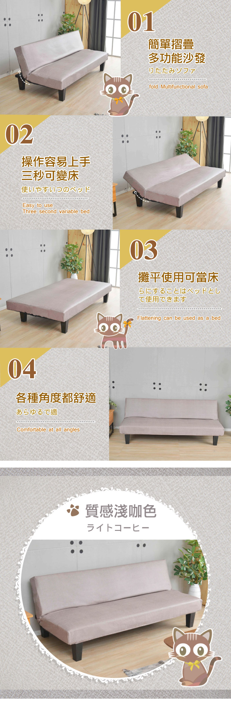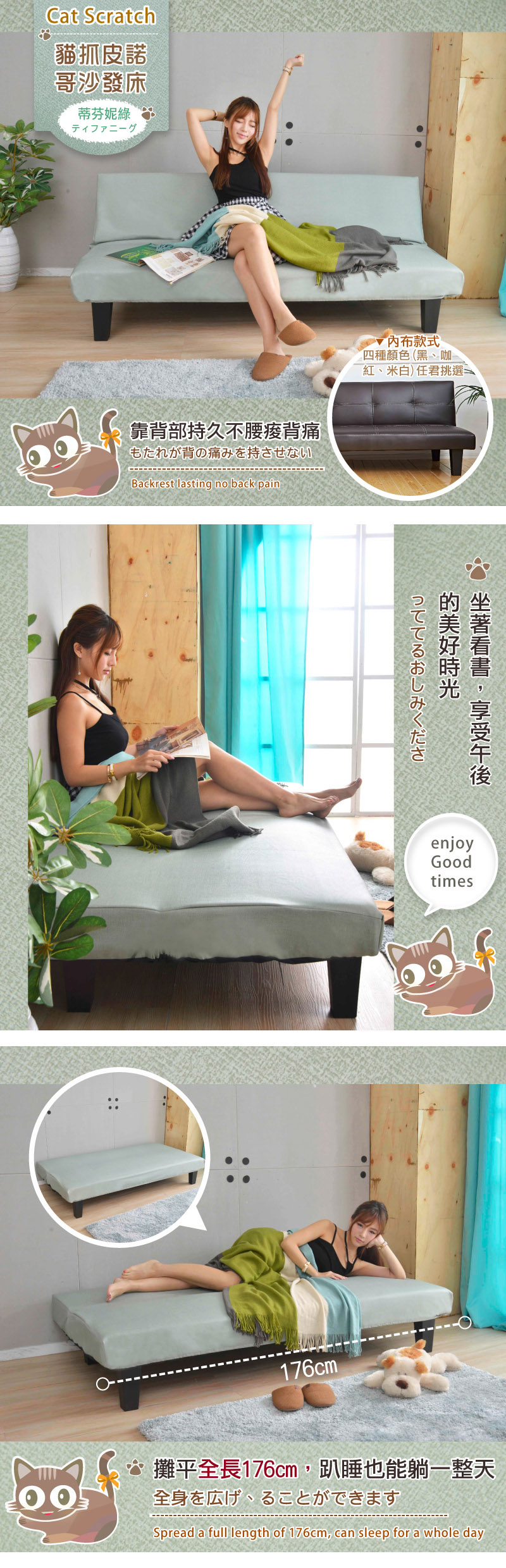 | 顏色 | 沙發(四色任選)-純真米白、 魅力紅色 、質感咖啡、沉穩黑色 貓抓皮沙發套(五色任選)-淺咖貓、灰黑貓、稻米貓、摩卡貓、蒂芬妮綠貓 |