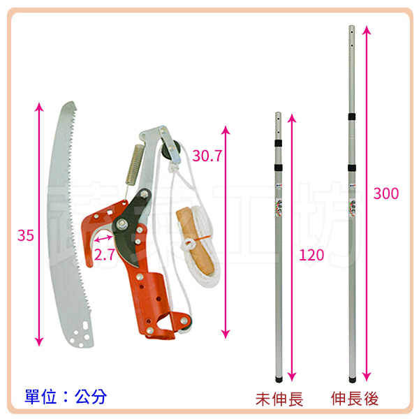 名稱:松格三米高枝剪(三滑輪.附鋸片)三段式伸縮鋁桿120~300CM(型號A515)