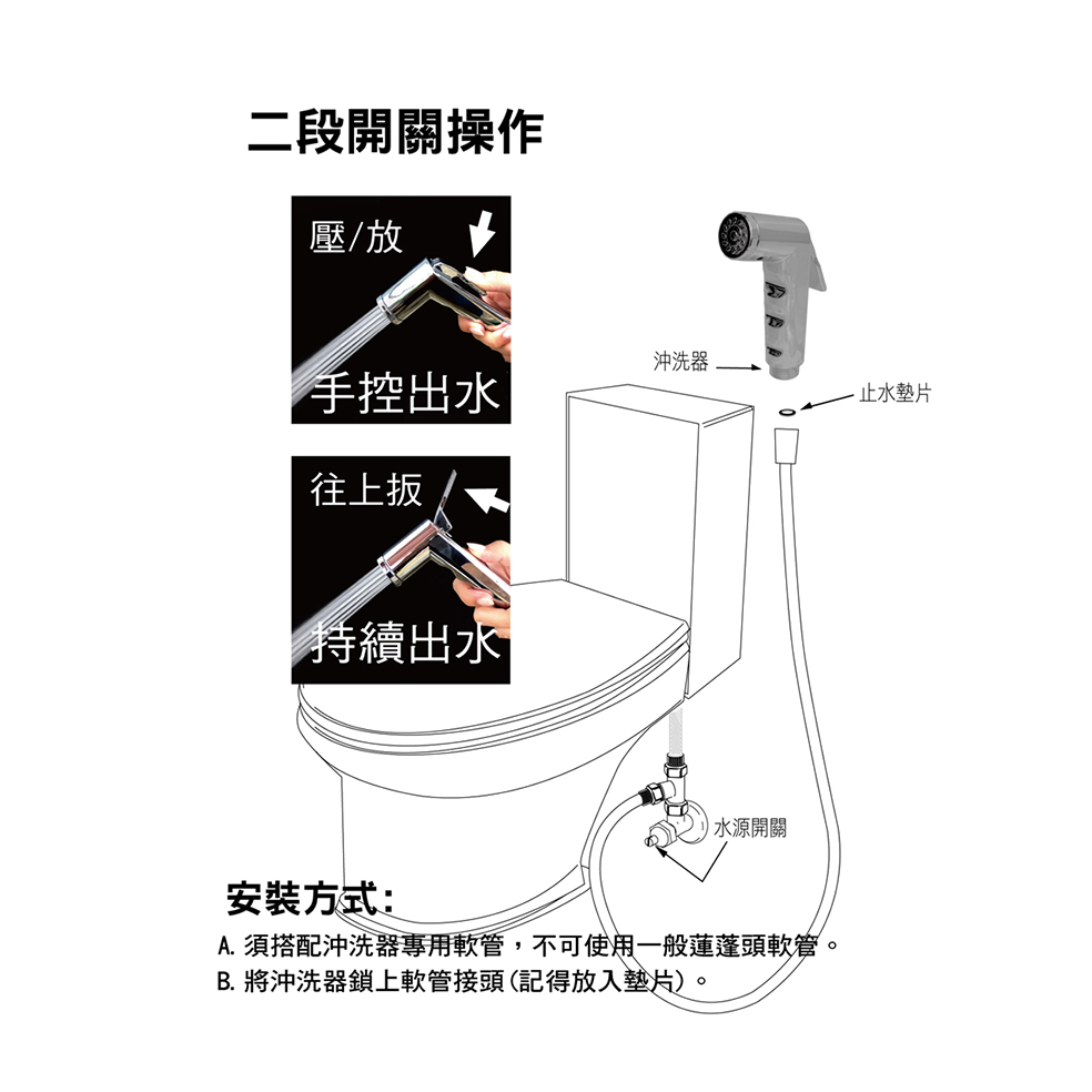 此款[尼斯二段式沖洗器-白色]二段式出水模式設計使用更方便,壓放把手就可隨意控制出水開或關,另外可將把手往上扳即可持續固定出水,沖洗更省力
