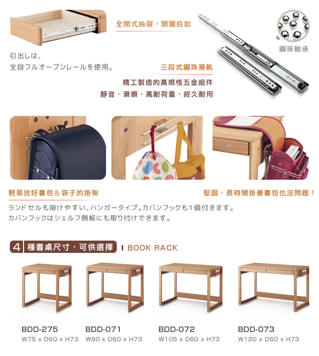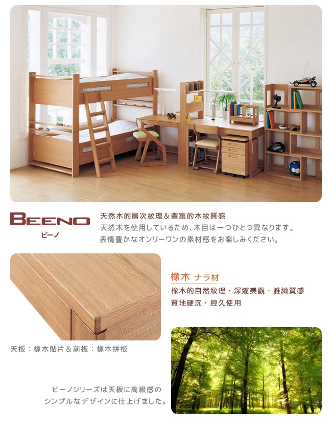 多樣的組合設計,從學齡到成人均適用。25種風格的組合樣式,在不同的年齡層、身形,以及各種的部屋格局,都能呈現專屬於您的書桌組。橡木質感的桌面,文雅的木紋,經久使用。淡雅風格、簡約功能、細緻品質,為您量身訂做的品味書桌,優雅生活的快樂度。