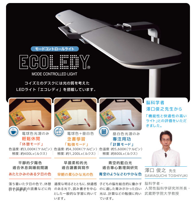 1965年,KOIZUMI照明事業正式開始。歷經半個世紀的改進與研發,開發出適合休閒/念書/專注的三種光色模式。腦科學家・澤口俊之先生推薦,多功能的KOIZUMI LED智慧護眼燈具,對於保護眼睛、孩子的大腦成長發育,有極大的幫助。