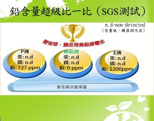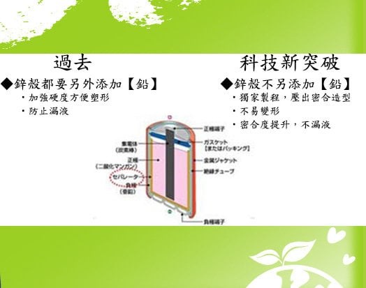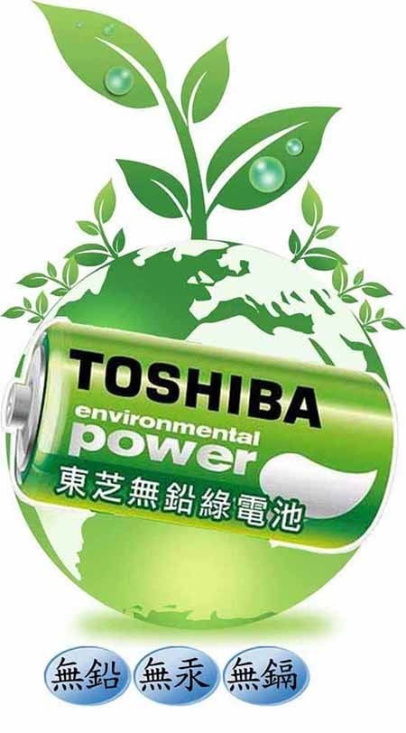 ◆ 乾電池包含汞、鉛、鎘三種有害重金屬,衛生署比照歐盟制定的合格規範標準,鉛含量須在4000ppm、汞5ppm、鎘200ppm,TOSHIBA東芝無鉛錄碳鋅電池經公證單位SGS檢測,皆未驗出鉛、汞、鎘含量,號稱是目前全球唯一無毒害的電池;若以無鉛電池取代台灣一年碳鋅電池進口量,一年可減少使用2.7公噸的鉛,拯救3千3百萬平方公尺土地,等於一個桃園市=1/8台北市。