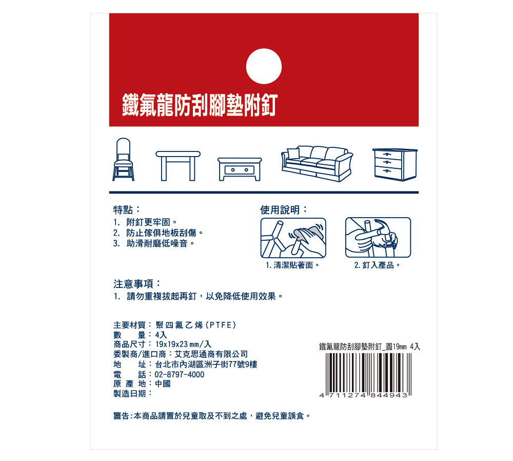 這款【鐵氟龍防刮腳墊附釘-圓 19mm 4入】使用鐵氟龍材質,低摩擦性可助滑,耐磨低噪音,防止家俱地板刮傷,此款付釘設計更牢固,適合經常移動使用的木製桌椅或家俱.
