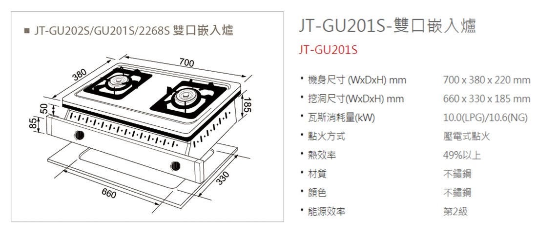 喜特麗JT-GU201SN-雙口嵌入爐-天然