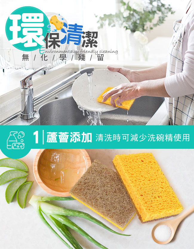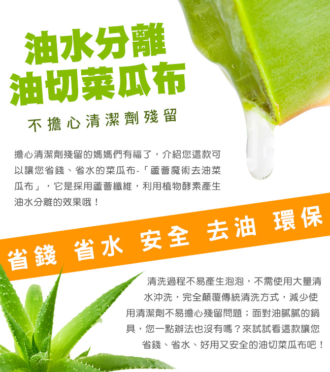 ◆利用蘆薈絲中特有的植物酵素原理產生油水分離,在清洗的過程中,將油與水分離,隨著刷洗的動作,油污將隨著水流出,輕鬆去油。