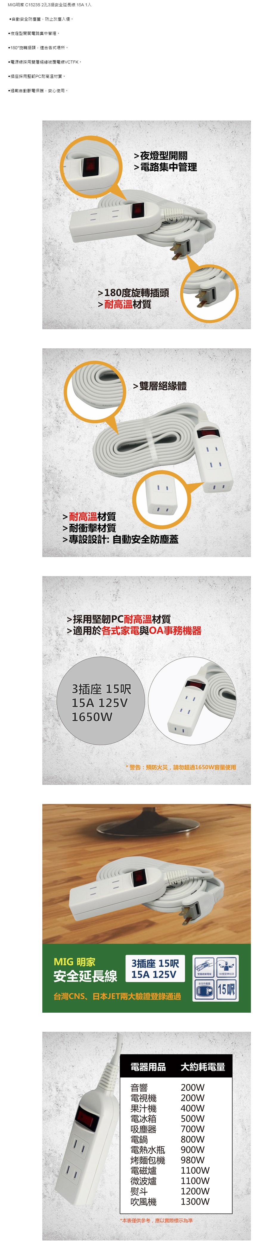【明家Mayka】C1523S-15 2孔1開3插15尺 防塵孔 延長線4.5m(180度 平貼插頭 中繼線 電源線)