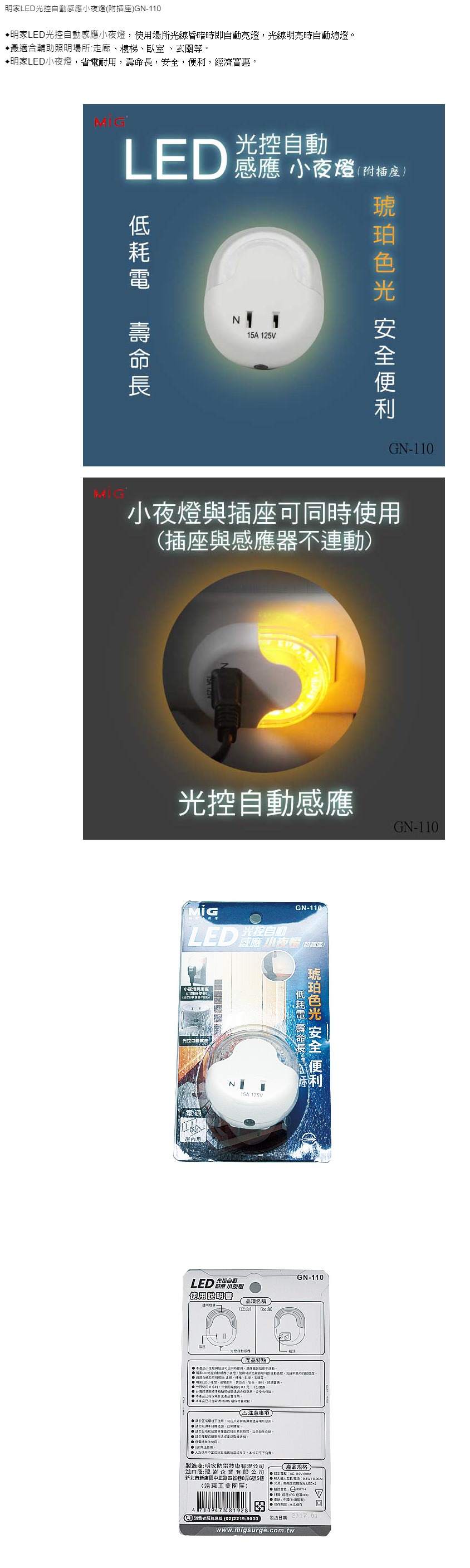 【明家Mayka】GN-110光控LED小夜燈 附插座 圓弧形琥珀光(自動感應 低耗電 低熱能)
