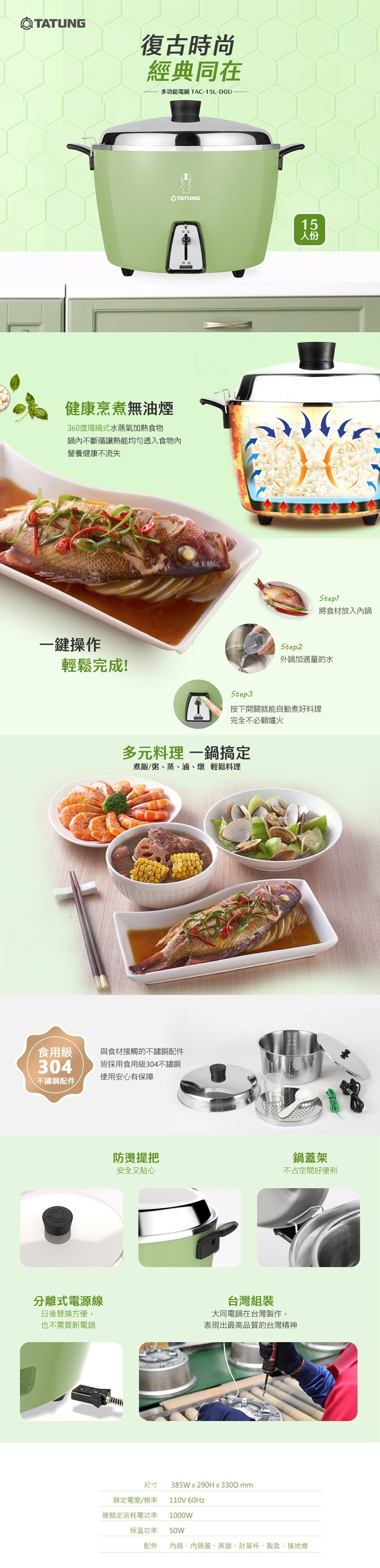 TATUNG 大同 15人份松柏綠不鏽鋼配件電鍋 TAC-15L-NGA