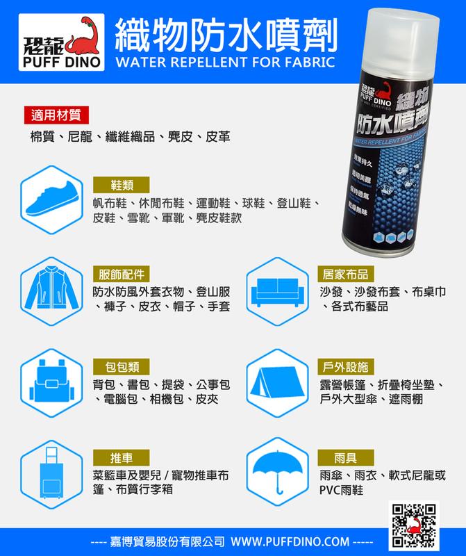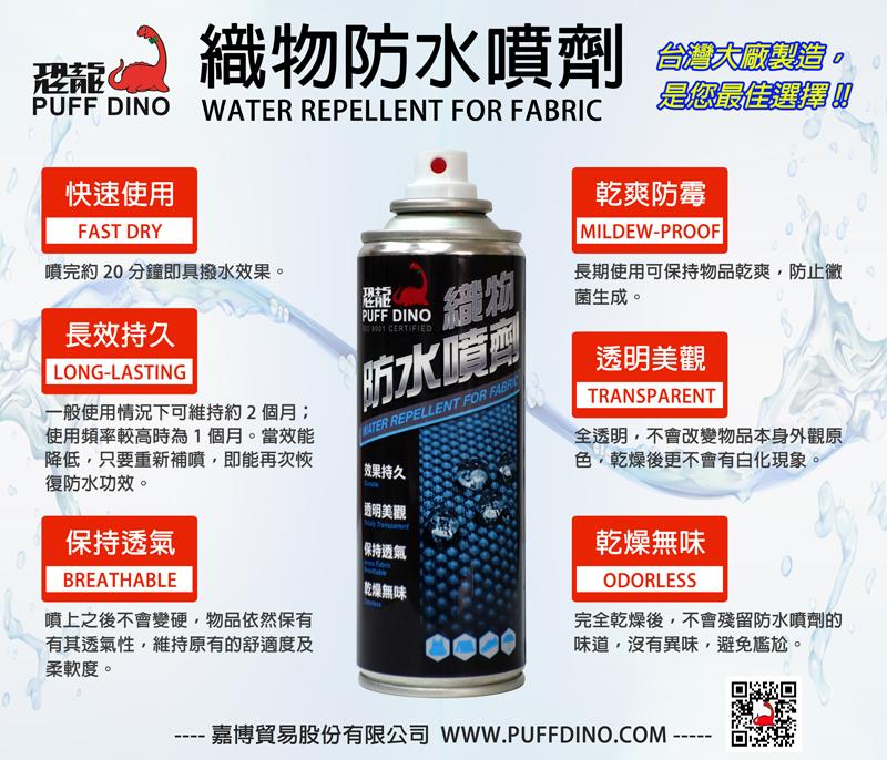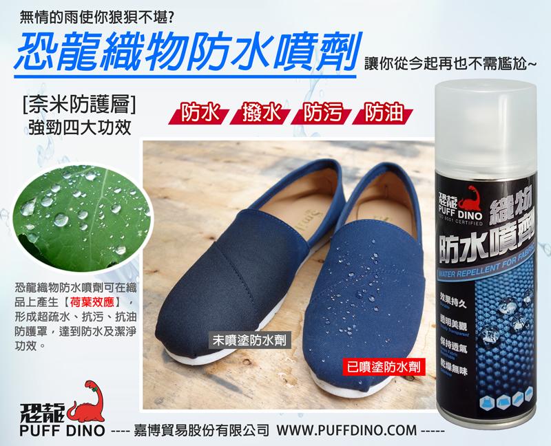 恐龍織物防水噴劑會在織物及皮革表面形成防水透氣保護層,將接觸到織物表面的水立即撥落,不會浸入孔隙中,確保織品的乾燥;具有防污的效果,維護物品的乾爽潔淨。使用在已具有防水效果的織物用品上(如:雨傘、帳篷、遮雨棚),可使雨水能更輕易迅速滑走,收納時不會殘留水滴,非常好整理。