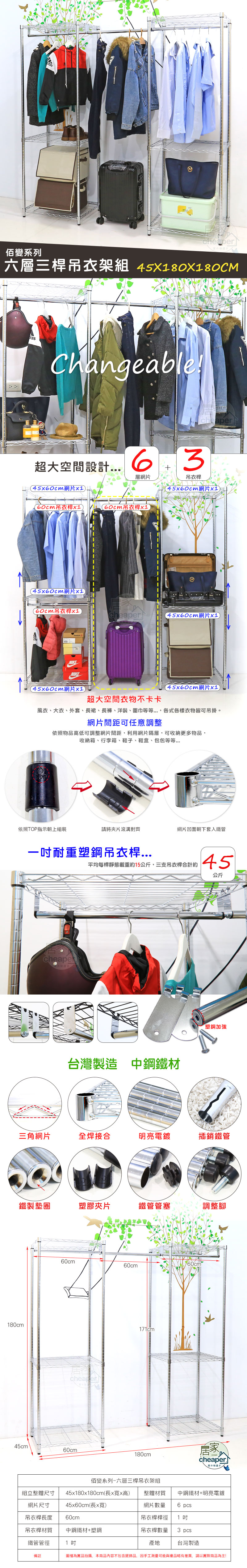 鐵力士三層單/雙桿吊衣架組 45X90X180CM